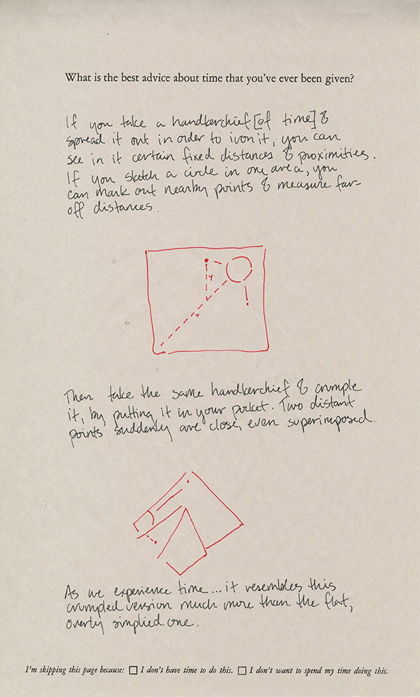 In 2015, the exhibition of ILSSA It's About Time workbooks traveled to Asheville BookWorks, NC and PRESS! at Massachusetts College of Liberal Arts (MCLA), North Adams. A compilation book containing facsimiles of two prompts from all participants was made by Publication Studio at Williams College Museum of Art; copies were given to all participating ILSSA members (along with a fresh copy of the It's About Time workbook in return for the completed one). This project was also shown at a group exhibition at the Museum at Florida State University, Tallahassee (2016), and displayed in ILSSA solo exhibitions at Visual Studies Workshop, Rochester, NY (2017) and Ringling College, Sarasota, FL (2018).